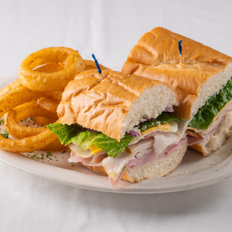 Sandwiches are served on white bread with lettuce, tomato, mayo, and your choice of fries, onion rings, or shoestring fries