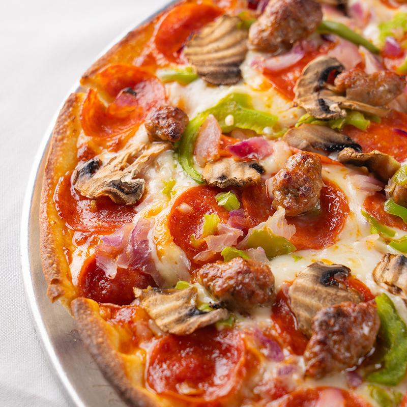 Toppings: Pepperoni, Italian Sausage, Spicy Sausage, Green Peppers, Onions, Black Olives, Artichoke Hearts, Tomatoes, Pepperoncinis, Mushrooms, Ham, Meatballs, Banana Hot Peppers, Pineapple, Ground Beef, Anchovies, Jalapeños, Chicken, Zucchini, Garlic, Broccoli & Spinach • Thin Crust is available upon request | Extra Thick Crust +$2.50 in 10" & 13" only | All of our pizzas are made with 100% Wisconsin provolone cheese | All pizzas are freshly made, please allow 25 minutes.